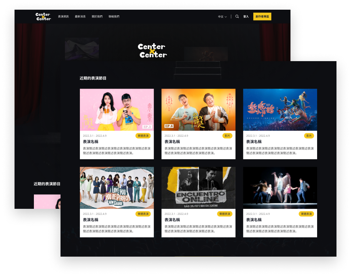 Center x Center是一個表演創作與售票的整合平台,創作者可以透過創作者社群來構思與規劃表演,與更多創作者合作交流,並發表自己的表演,消費者將可以透過平台來購票、給予創作者回饋,從而建立更優良的創作環境。